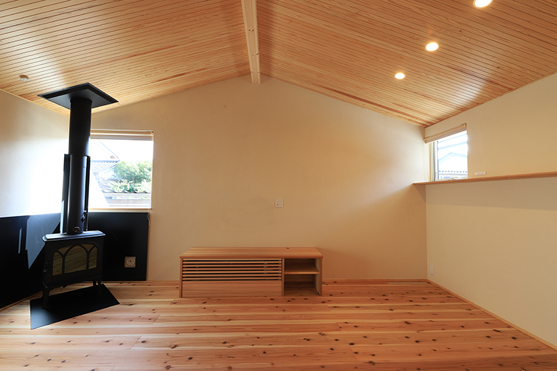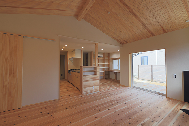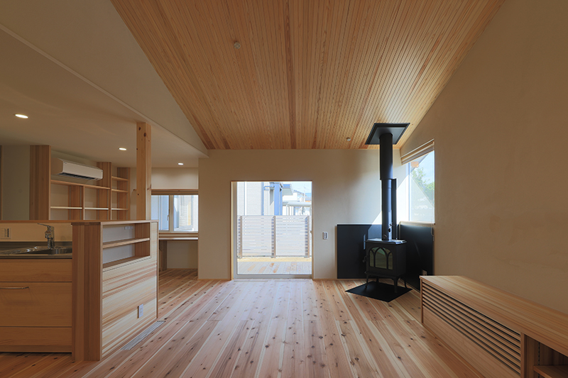無垢材の床や造作家具、珪藻土のやわらかな質感と、勾配天井が生む開放感。
