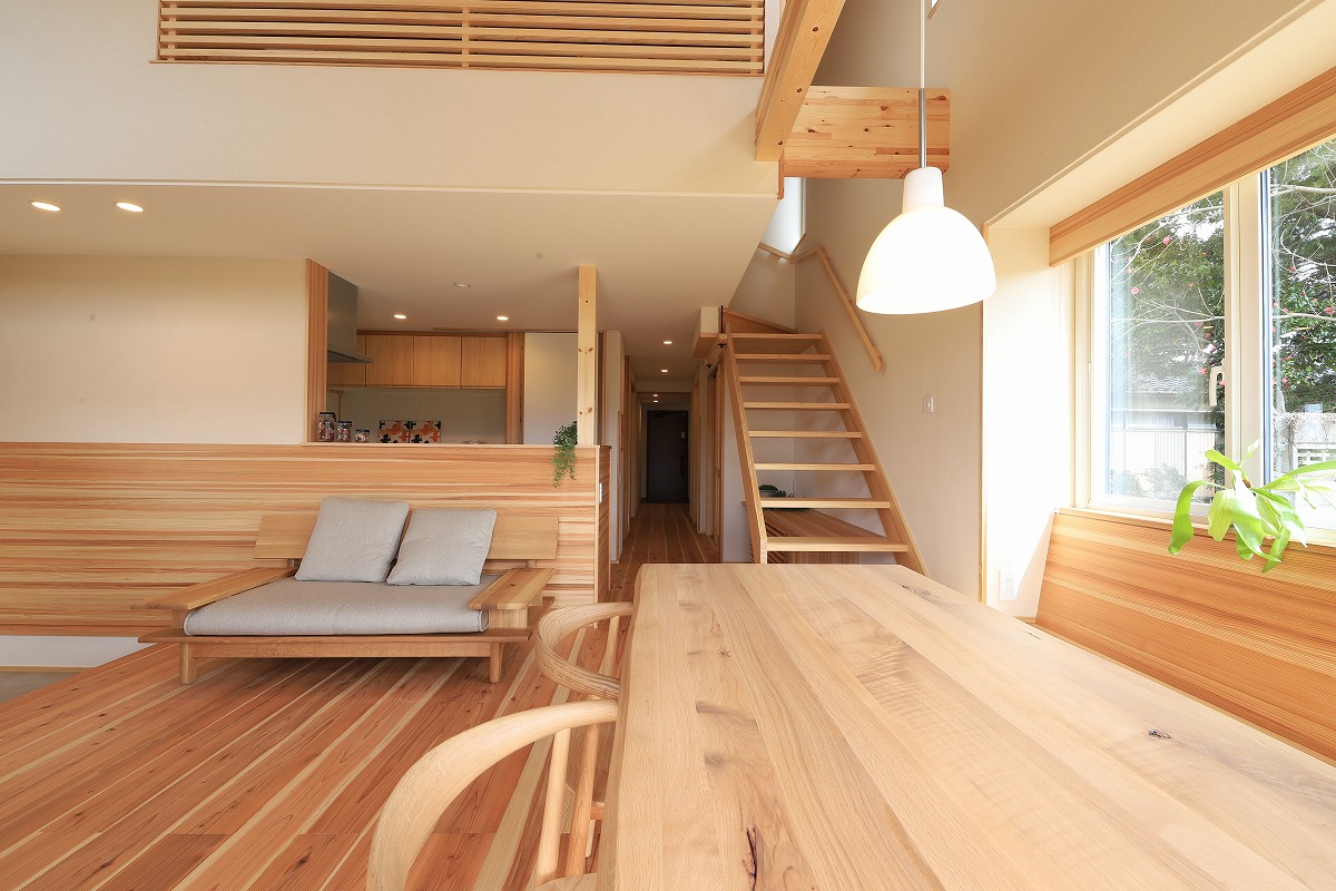 開放的なダイニング。 窓からの景色や2階とのつながりも開放的な空間をつくっています。